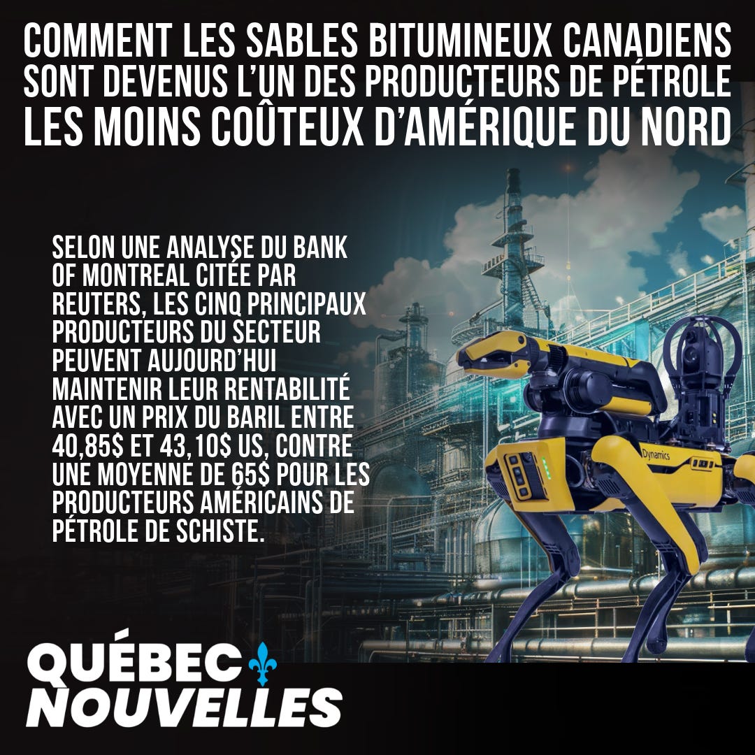 Mais en 2025, le vent a tourné. Grâce à une transformation technologique ambitieuse, une meilleure gestion des opérations, et des stratégies de réduction des coûts soutenues, les sables bitumineux canadiens se classent désormais parmi les producteurs les plus compétitifs d’Amérique du Nord. Selon une analyse du Bank of Montreal citée par Reuters, les cinq principaux producteurs du secteur — Canadian Natural Resources, Suncor, Cenovus, Imperial Oil et MEG Energy — peuvent aujourd’hui maintenir leur rentabilité avec un prix du baril de West Texas Intermediate (WTI) entre 40,85 $ et 43,10 $ US, contre une moyenne de 65 $ pour les producteurs américains de pétrole de schiste.