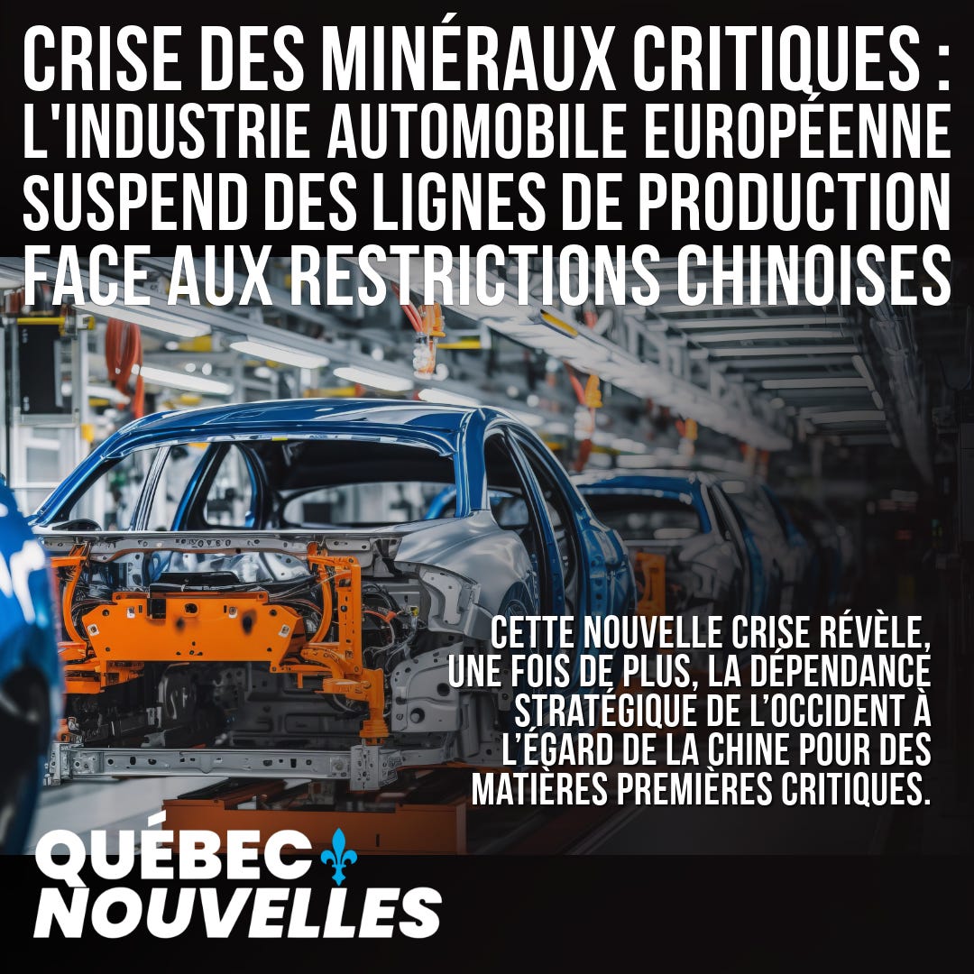 L’industrie automobile européenne fait face à une onde de choc provoquée par la décision de la Chine de suspendre l’exportation de nombreuses terres rares et aimants spécialisés. Des usines de pièces automobiles sur le continent ont temporairement suspendu leur production, tandis que le constructeur allemand BMW admet que des segments de son réseau d’approvisionnement sont affectés par des pénuries croissantes. C’est ce que rapportent Victoria Waldersee (Berlin), Marie Mannes (Stockholm) et Hakan Ersen (Francfort) dans une dépêche de Reuters, avec une rédaction centrale assurée par Josephine Mason à Londres.